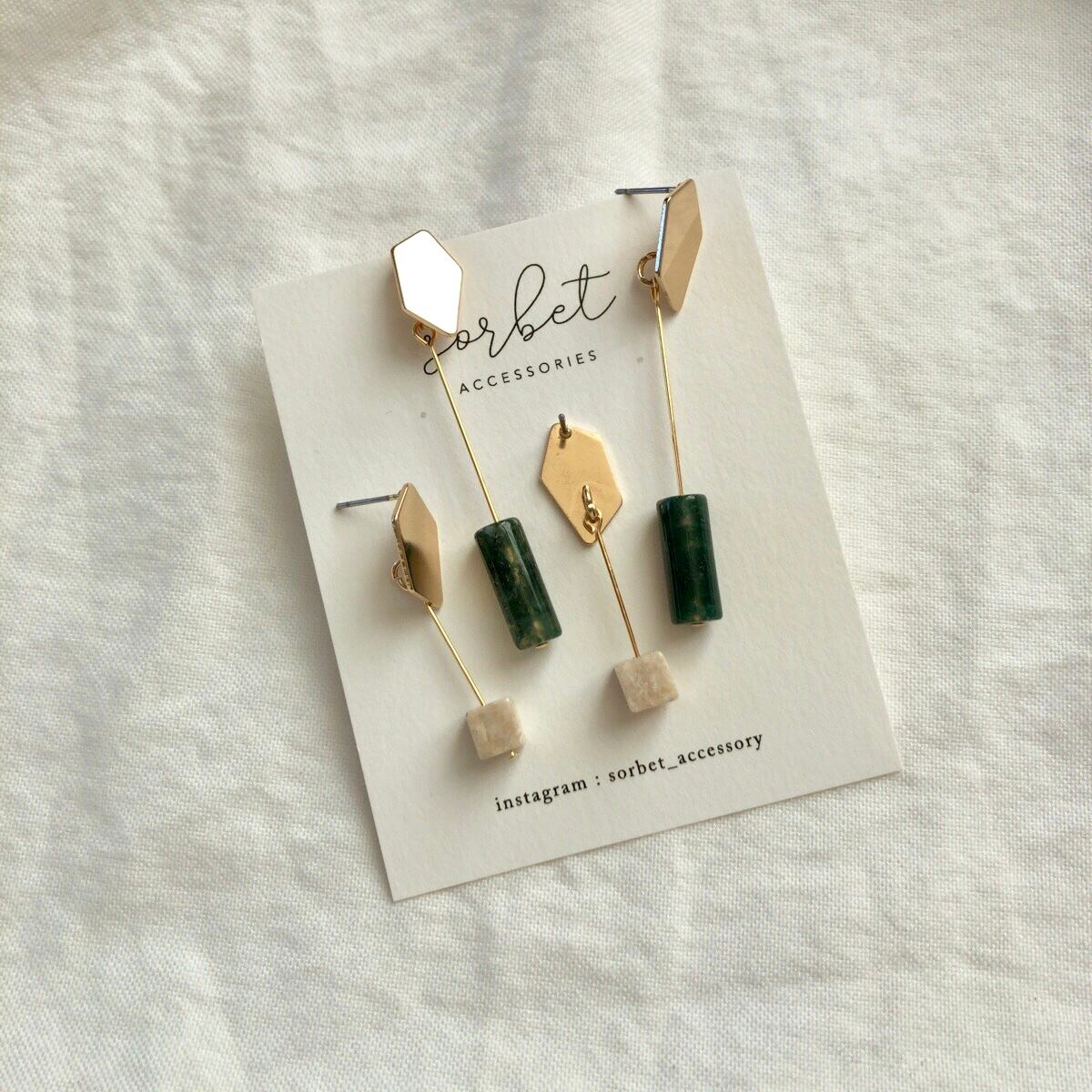 ベージュとモスグリーンの2種類の天然石を使ったアシンメトリーなデザインピアス。