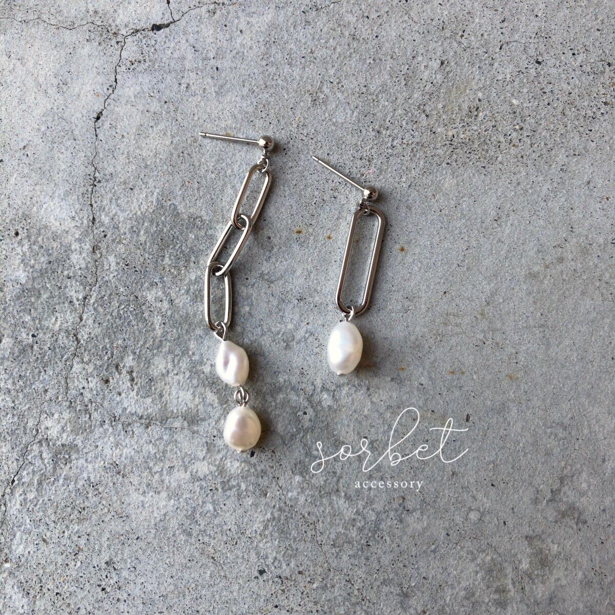 シルバーチェーン×淡水パールアシンメトリーピアス