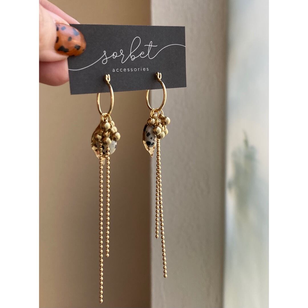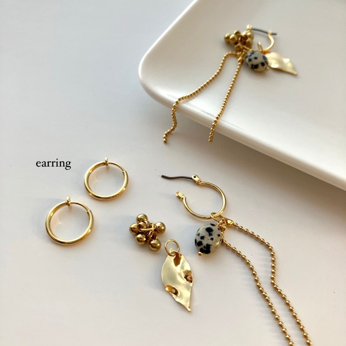 ダルメシアン柄の天然石にメタルリーフやボールチェーン等を合わせたフープピアス。