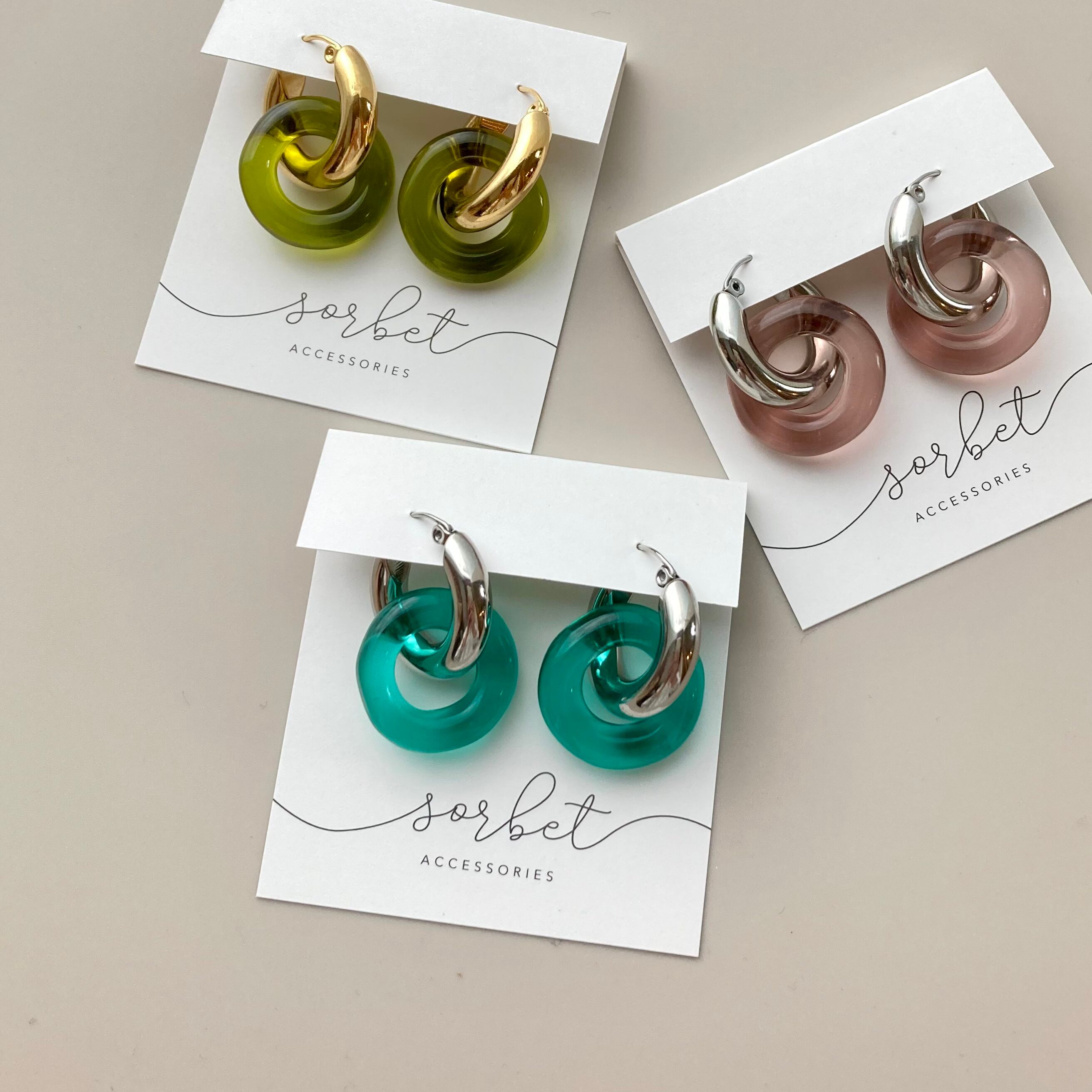 太めのフープとカラフルなリングの2wayピアス。