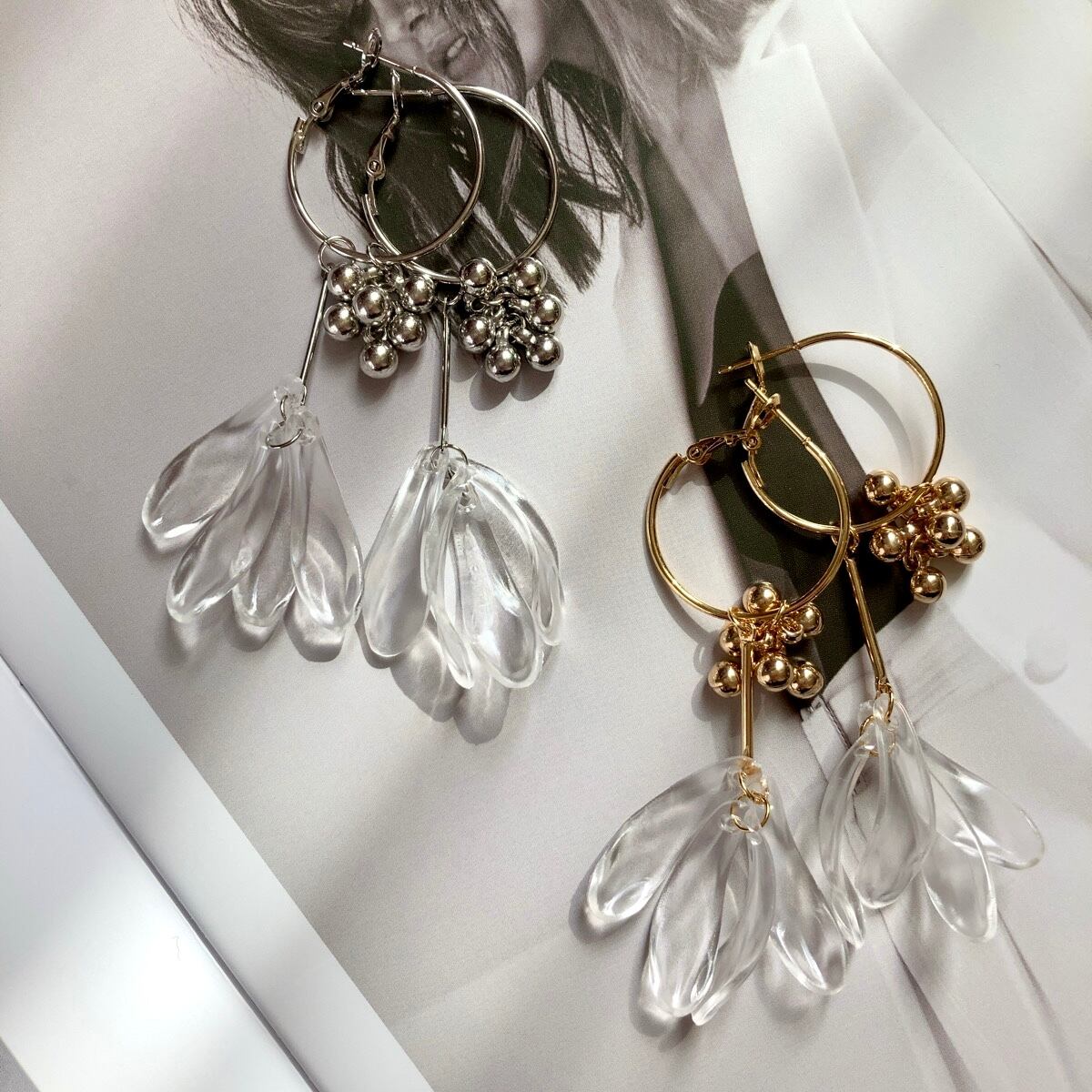粒々メタルとクリアな花びらのフープピアス。