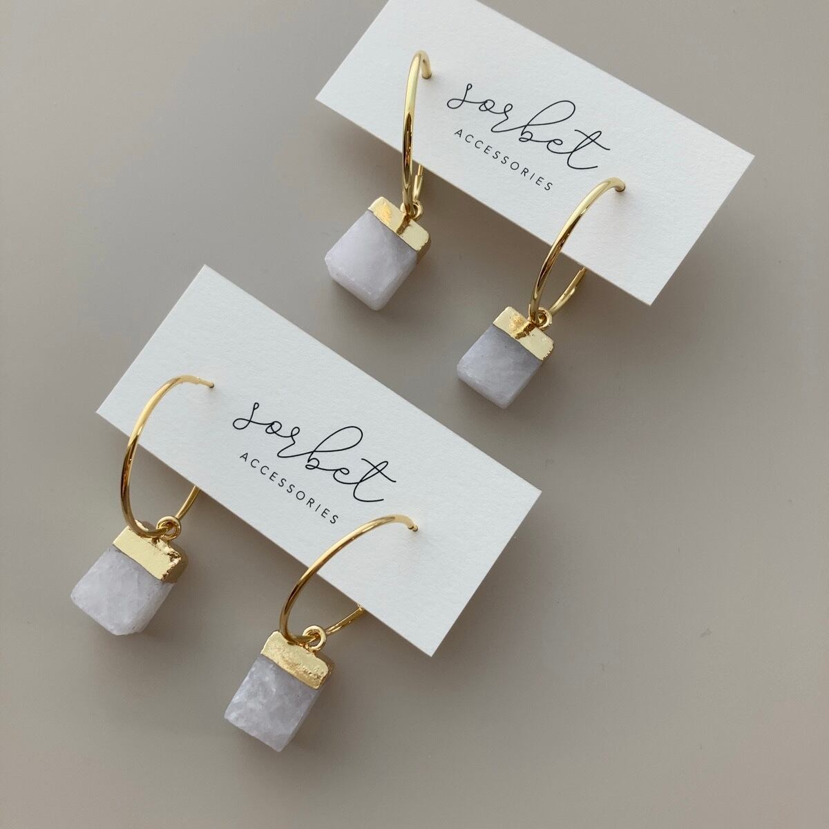 シュガーキューブのような形状の天然クリスタルにシンプルなU字のロングフックを合わせてスタイリッシュに仕上げました。